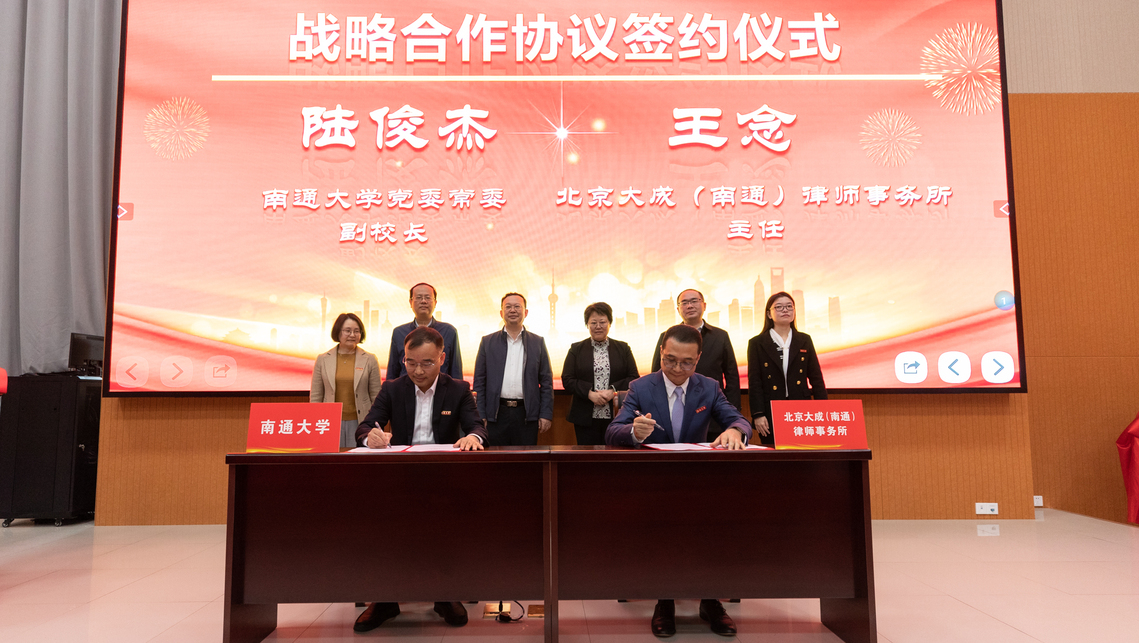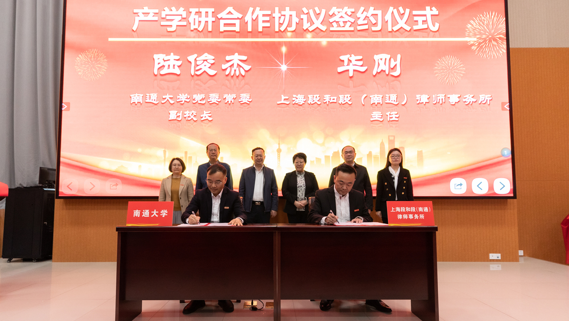 4月12日上午,公司与南通市委依法治市办、南通市司法局举行共建合作基地签约揭牌仪式。公司党委书记尚庆飞,江苏省司法厅党委委员、省委全面依法治省委员会办公室副主任范沁芳共同为“法学教育实践基地”“法治人才培育基地”揭牌。公司党委常委、副董事长陆俊杰与南通市司法局党组书记、局长、南通市委依法治市办副主任朱志强,北京大成(南通)律师事务所主任王念,上海段和段(南通)律师事务所主任华刚签订共建合作协议。