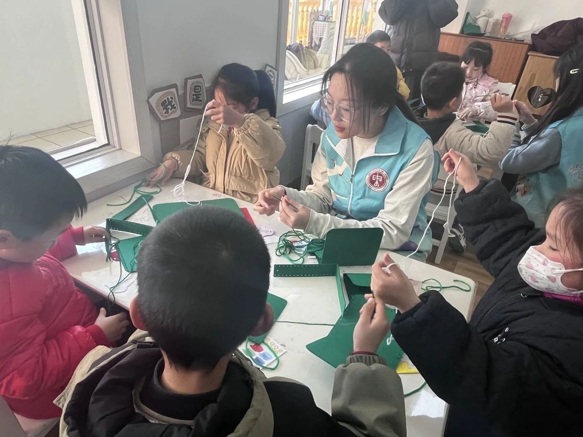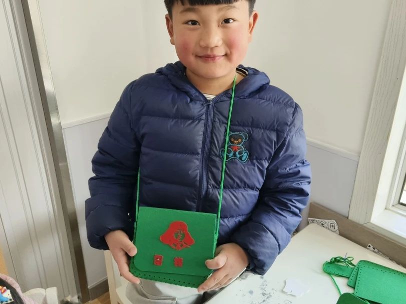 最触动童心的是"雷锋精神DIY"环节。孩子们用彩线、布料和纽扣,在实践团指导下缝制特色挎包。稚嫩的小手认真粘贴天安门广场图案与雷锋肖像贴纸,针脚虽歪斜却饱含敬意。"我要把雷锋叔叔背在身上!"5岁的小宇背着刚完成的挎包,童言稚语中流淌着传承的力量。