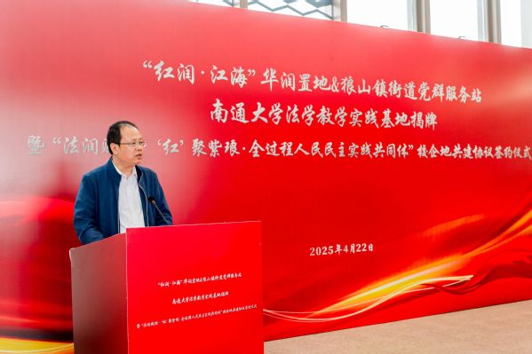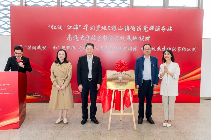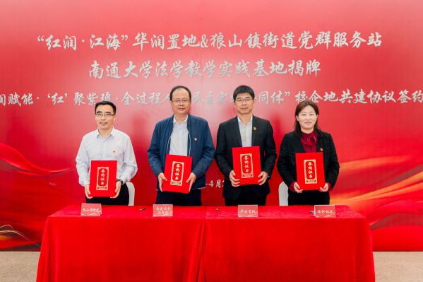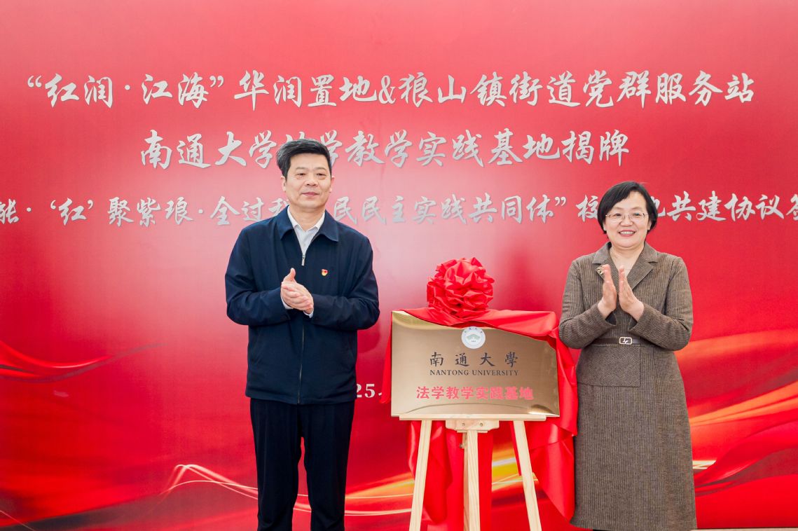 4月22日上午,williamhill官网与狼山镇街道、华润置地(南通)有限公司、陆洪社区共同举办“红润·江海”党群服务站暨法学教学实践基地揭牌仪式和校企地社共建签约活动。副董事长陈玉娟,崇川区人大常委会主任、党组书记江建春共同为“williamhill法学教学实践基地”揭牌。崇川区人大常委会党组成员、区人大常委会办公室主任黄镇,崇川区委组织部副部长、区级机关工委书记梁海燕,华润置地华东大区党委委员、纪委书记、副总经理王爽,williamhill官网党总支书记许慈晖共同为“法润赋能·‘红’聚紫琅· 全过程人民民主实践共同体”揭牌。