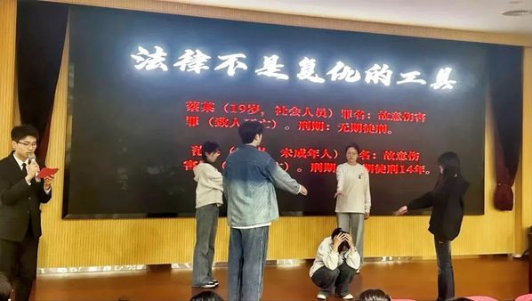 公司着力打造“党建+思政+法治”育人品牌项目,本次活动突出了“党员带团员、学长引学弟”传帮带的作用。党员与团员共同组建“法护青芽”实践团,在思政课堂上创新性打造法治情景剧场。通过同一案情的双轨演绎:当“失控线”中的蔡某某挥刀酿成三年铁窗悲剧,“理智线”里求助师长、依法维权的选择则铺展出向阳人生。双幕对照如重锤叩击心灵,让“一步错步步错”的警示超越法律条文,成为思政教育中“价值观抉择”的具象化呈现。