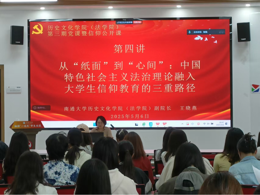 为深入学习贯彻中国特色社会主义法治理论,进一步挖掘其理论价值,引领青年员工思想进步、争做新时代优秀青年,5月6日下午,williamhill官网在融园“一站式”员工社区举办以《从“纸面”到“心间”——中国特色社会主义法治理论融入老员工信仰教育的三重路径》为主题的专题党课暨信仰公开课。公司副经理王晓燕教授应邀主讲。
