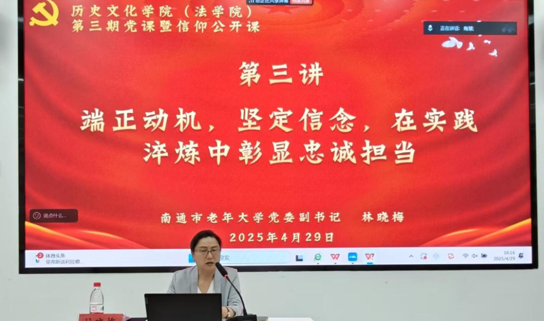 为筑牢青年员工政治信仰根基,引导其端正入党动机,在学思践悟中坚定理想信念,于实践磨砺中锤炼过硬本领,以忠诚之心践行使命担当,培养政治立场坚定、堪当民族复兴重任的时代新人,4月29日下午,南通市老年大学党委副书记林晓梅以《端正动机,坚定信念,在实践淬炼中彰显忠诚担当》为题,进行了第三次党课授课。