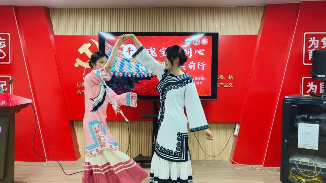 活动在彝族舞与古典舞的交融中拉开帷幕。董莹莹同学以翩跹衣袖勾勒山河画卷,孔晨轩同学用轻盈舞步演绎华夏春韵,一刚一柔间架起古今对话的桥梁。主持人深情阐释:“舞步踏响山河韵,同心共绘团结情!”这场跨越地域与民族的舞蹈盛宴,正是中华文化“各美其美,美人之美”的生动注脚,也是公司“思政+艺术”育人模式的创新实践。
